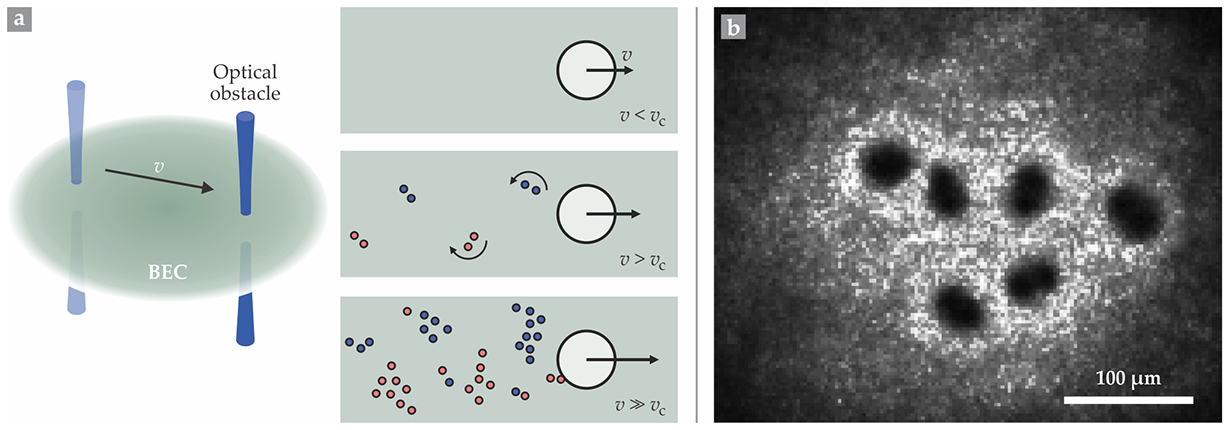 Figure 2. Evolution of vortex shedding in a Bose–Einstein condensate.(a) If a repulsive potential at the focus of a laser beam is slowly scanned across a BEC (left), at a velocity v below some critical velocity vc, the flow of atoms around it is laminar and no vortices appear (right). Just above vc, like-signed (blue or red) vortices are nucleated and shed from alternating sides of the potential as corotating clusters. Much above vc, the clusters interact strongly enough to turn the flow turbulent. (b) In this experimental demonstration, a 10-µm-wide beam was moved at 1.6 mm/s across a BEC of sodium atoms, and then the BEC was allowed to expand. Each of the six dark regions is a cluster containing two vortices. (Adapted from ref. 2.)