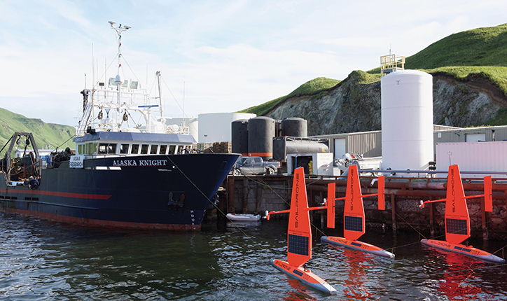 To measure ice thickness, NOAA has buoys designed to drift and become locked into the ice pack. In July the agency launched three wind-powered sail drones from the Alaska Peninsula. They are equipped to measure physical, biological, and chemical parameters, including acidification, in the ocean and atmosphere.