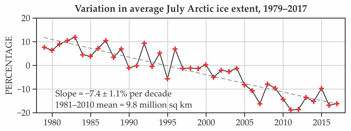 Last year’s Arctic Ocean sea-ice minimum, 4.1 × 106 km2, tied with 2007 for the second lowest since satellite observations began in 1979, and this year’s annual ice retreat is on course to approach the record low coverage of 3.4 × 106 km2 set in September 2012. The 10 lowest observed September ice minimums have occurred since 2007, according to National Snow and Ice Data Center (NSIDC) statistics.