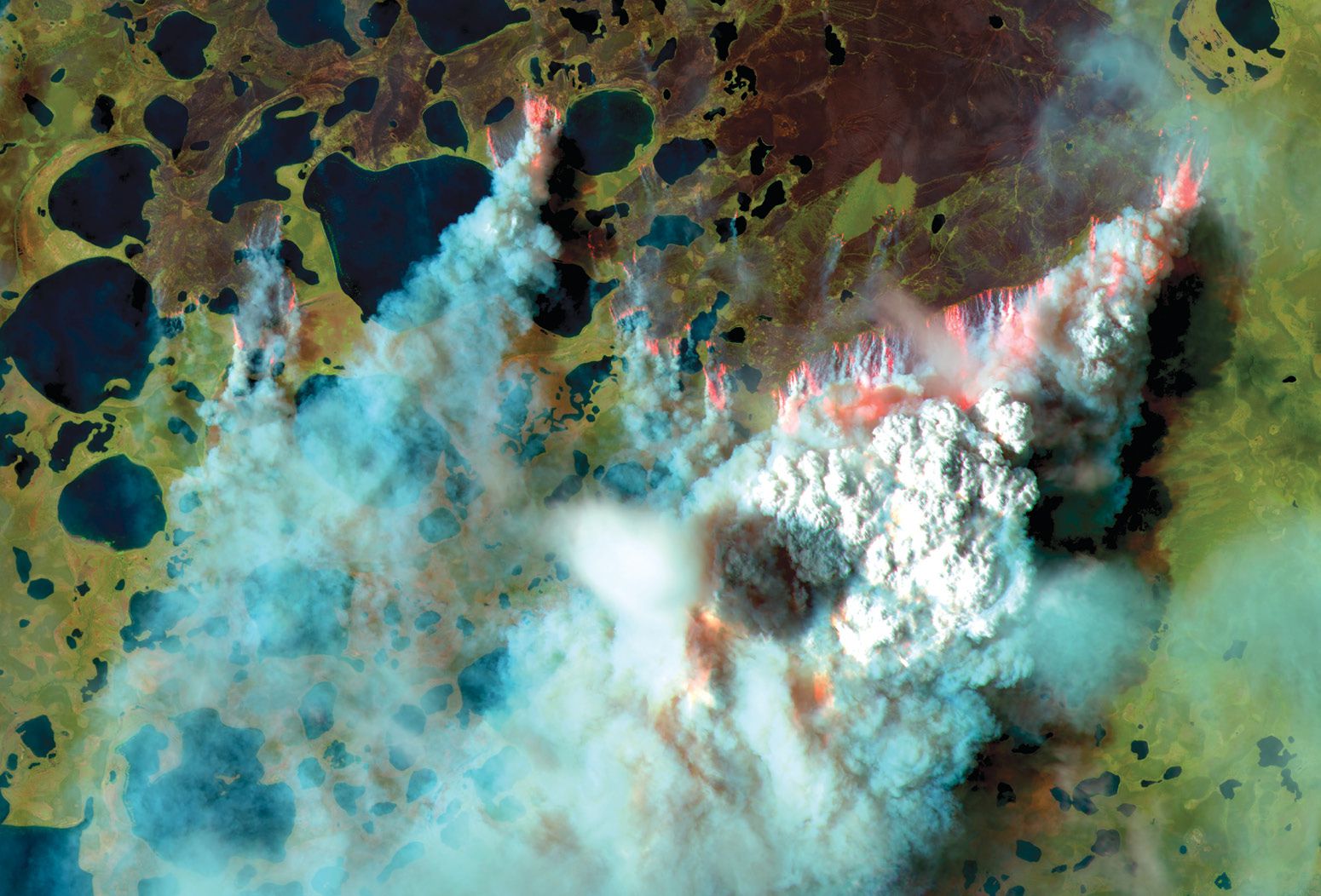 A pyrocumulus cloud formed from a wildfire that burned this 30-kilometer-wide area on 6 August 2020, during one of the most intense Siberian Arctic fire seasons of the past 40 years. (Satellite photo created by Adrià Descals; imagery acquired by the European Space Agency.)