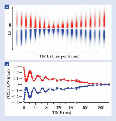 The repulsion between clouds of atoms with oppositely oriented spins causes the clouds to bounce off one another. (a) A map of the excess density of spin-up (red) or spin-down (blue) atoms in each cloud during the first bounce. Images of the clouds were taken in 1-ms intervals. The axis of the cylindrically symmetric trap lies along the vertical direction in the image. (b) The centers of mass of the two spin clouds oscillate until the bouncing motion is damped. It takes about one second for the two clouds to diffuse into one another. (Adapted from ref.