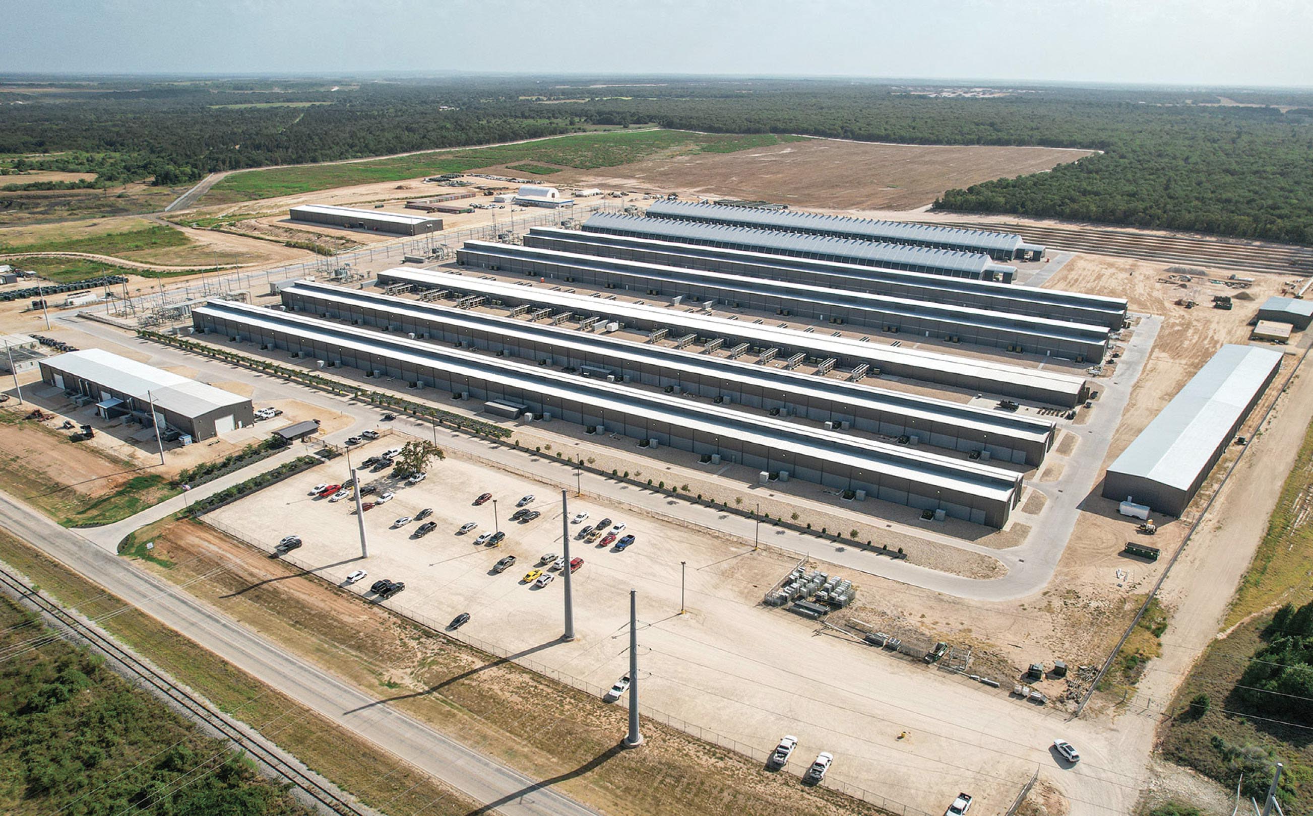 Riot Platforms’s bitcoin mining facility in Rockdale, Texas. With an installed capacity of 700 MW, it is the largest bitcoin mining farm in North America. The company, which produced 6626 bitcoins in 2023, is constructing a larger farm in the state that will have a capacity of 1 GW.