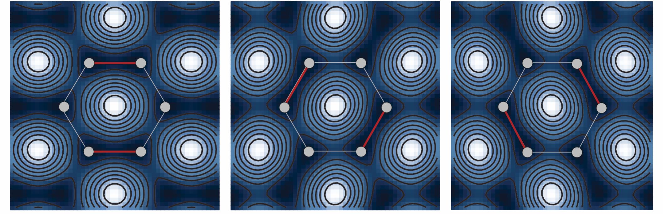 Topological physics in a honeycomb optical lattice, created from three interfering lasers angled 120° from one another. Modulating the lasers’ intensities periodically lowers the energy barriers along each set of parallel edges in turn, as shown by the red line segments. That protocol engenders qualitatively different behavior in the lattice bulk and at its edges. (Adapted from ref. 1.)