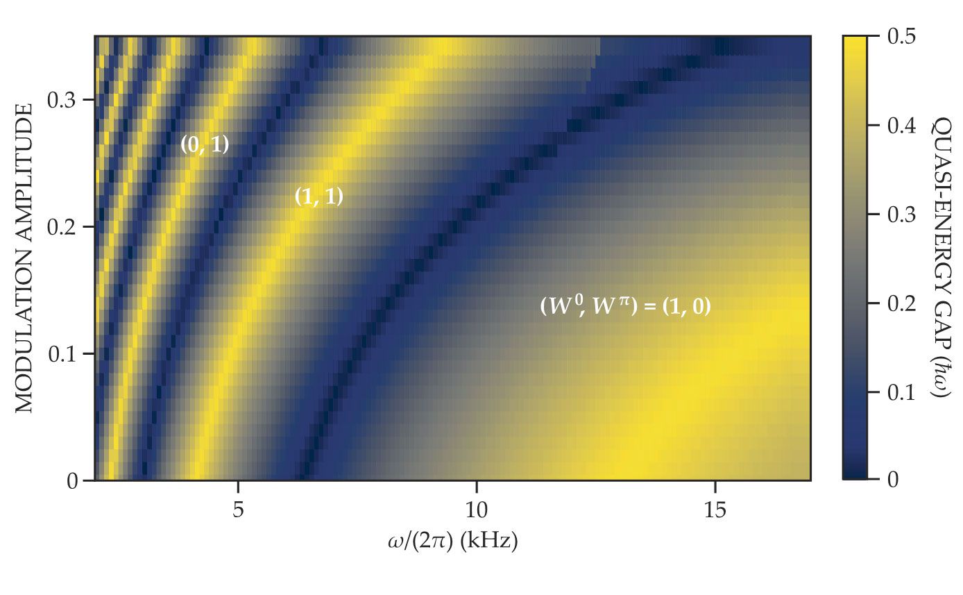 Mapping the phase diagram of the driven atomic system. Interferometric measurements probe the smaller of the two energy gaps—g0 and gπ in figure 2—as a function of the modulation amplitude and frequency ω. When one of the gaps is zero, the bands touch and an edge mode can appear or disappear. The dark blue lines therefore mark the boundaries between topological phases. The anomalous Floquet regime, in which both winding numbers W0 and Wπ equal 1, is the second yellow region from the right. (Adapted from ref. 1.)