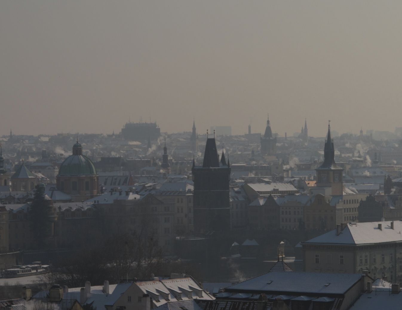 Smog looms over Prague on a February day. The pollutant, which forms when particulate matter reacts with UV radiation in the atmosphere, is a major contributor to respiratory disease. Still, it’s unclear how the large particles found in smog can grow in urban air. (Courtesy of Vojife/Wikimedia Commons, CC BY 3.0
