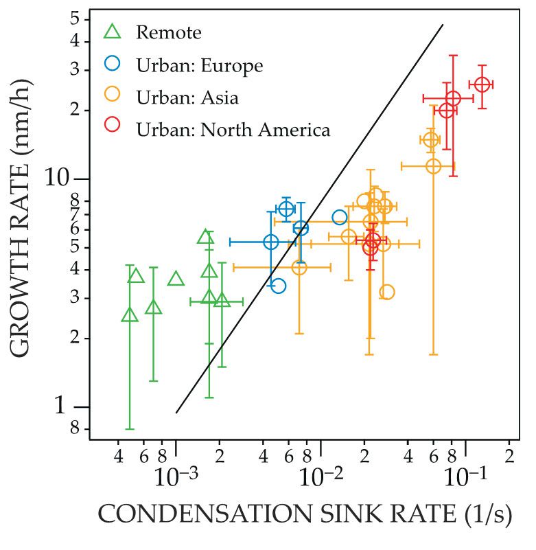 Atmospheric particle growth rates, shown here on the vertical axis, are only modestly faster in many urban environments (red, orange, and blue dots) than in remote ones (green triangles). The condensation sink rate (horizontal axis) describes how quickly newly formed clusters are scavenged by existing particles and is higher in urban environments than in remote ones. The persistence of those clusters depends on the ratio of the condensation sink and growth rates (the slope of the black line corresponds to a constant ratio), with small urban particles likely to be lost by scavenging unless they grow quickly. (Adapted from ref.