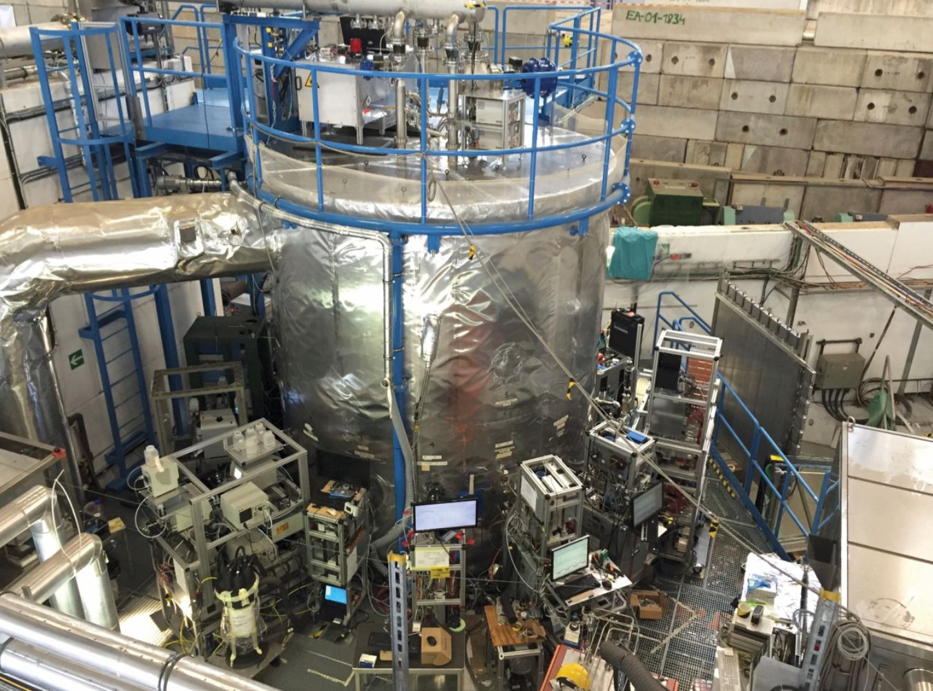 The CLOUD (Cosmics Leaving Outdoor Droplets) chamber at CERN is a 26-cubic-meter tank in which temperature and gas concentrations are carefully controlled to simulate natural atmospheric conditions between the ground level and the stratosphere. The proton synchrotron serves as an artificial source of cosmic rays, which simulates natural atmospheric conditions and may stabilize particles that form from the ionized gases in the chamber. External instrumentation allows for constant monitoring of the chamber’s contents. (Courtesy of CERN/Neil Donahue.)