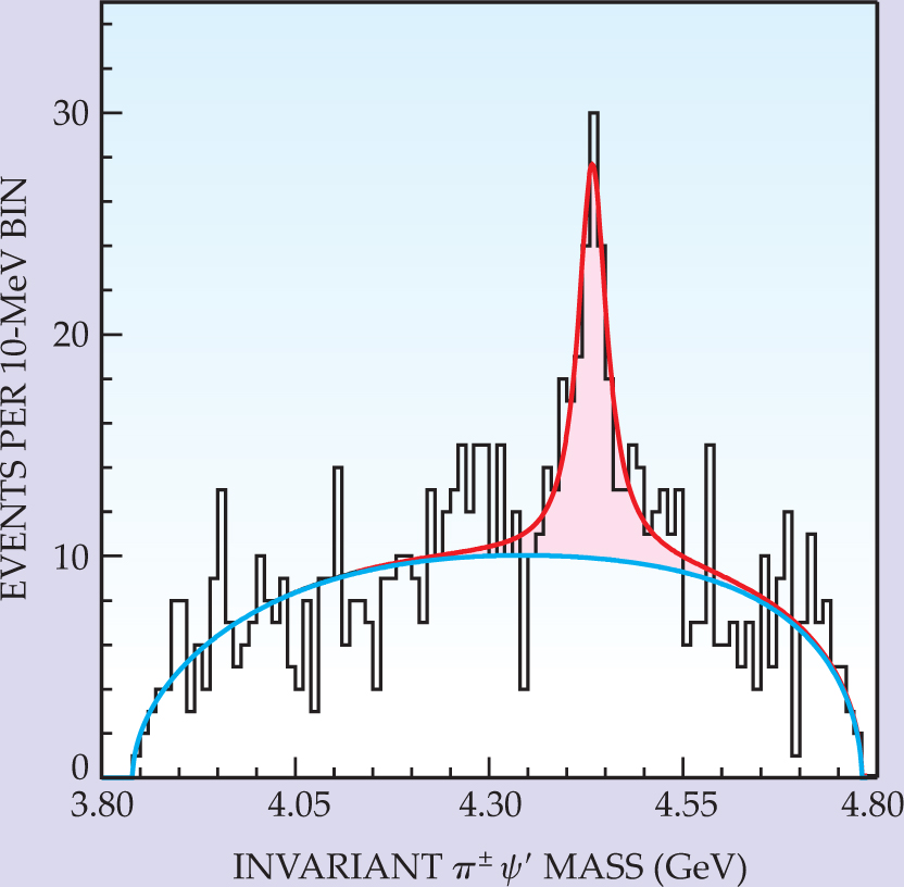 Evidence for the existence of a manifestly exotic meson—a meson that can’t be simply a quark–antiquark bound state—is the peak at 4.43 GeV in the invariant-mass distribution of the pion and the Ψ’ charmonium meson from the decays B → Ψ’ π± K of charged and neutral B mesons from the KEKB collider in Japan. The red and blue curves indicate fits for the resonant peak and its background. The data analysis attributes to the peak a statistical significance of 6.5 standard deviations and an intrinsic width of about 45 MeV.