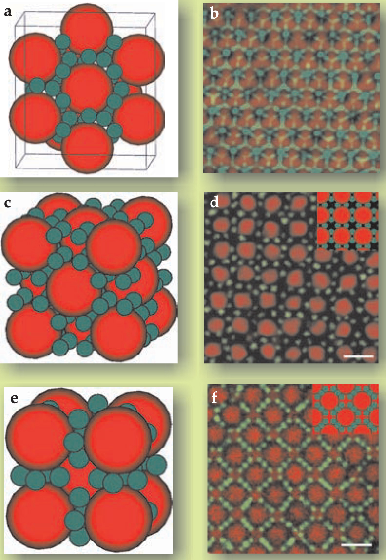 Figure 1. Equilibrium structures that form in the lab also form on the computer. In both cases, the starting point is a colloidal suspension of negatively charged small particles (radius 0.31 µm) and positively charged larger particles (radius 1.16 µm). Panels a, c, and e show computer-predicted unit cells. The other panels show crystal planes observed in the lab with confocal optical microscopy. The inserts in panels d and f are the corresponding computer predictions.