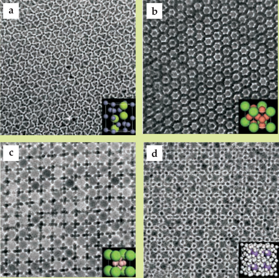 Figure 2. Diverse structures are formed spontaneously by particles of different materials, radii, and stoichiometries. (a) 6.2 nm PbSe, 3.0 nm Pd, 1:2. (b) 7.2 nm PbSe, 5.0 nm Au, 1:5. (c) 5.8 nm PbSe, 3.0 nm Pd, 1:6. (d) 7.2 nm PbSe, 4.2 nm Ag, 1:13. Insets show modeled unit cells.