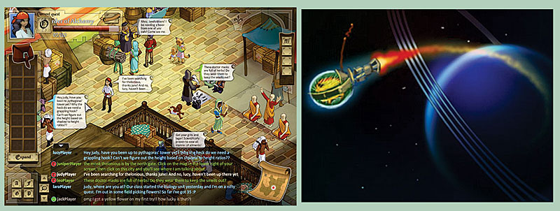 Cracking science puzzles takes on a whole new meaning in the virtual world. In a soon-to-be-released online game (left), players help each other solve biology and math quests. In SURGE EPIGAME (right), players propel a spaceship using their knowledge of Newtonian mechanics.