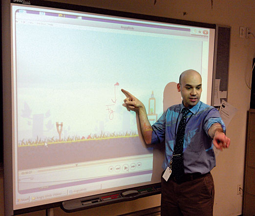 Physics teacher Frank Noschese at John Jay High School in Cross River, New York, uses the popular game Angry Birds to explain Newton’s laws to his class.