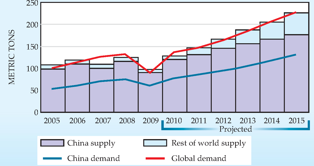 China has been restricting rare-earth exports since 2006, and those quotas were tightened for the first half of 2010, to 5978 tons, down from the 6685-ton limit in place for the first half of 2009, Kingsnorth says. China also imposes a 25% tax on exports of rare earths, a trade practice that contravenes World Trade Organization rules. Kingsnorth forecasts that production of rare earths will satisfy global demand in 2015. But he cautions that supplies of neodymium, dysprosium, and terbium will be very tight.