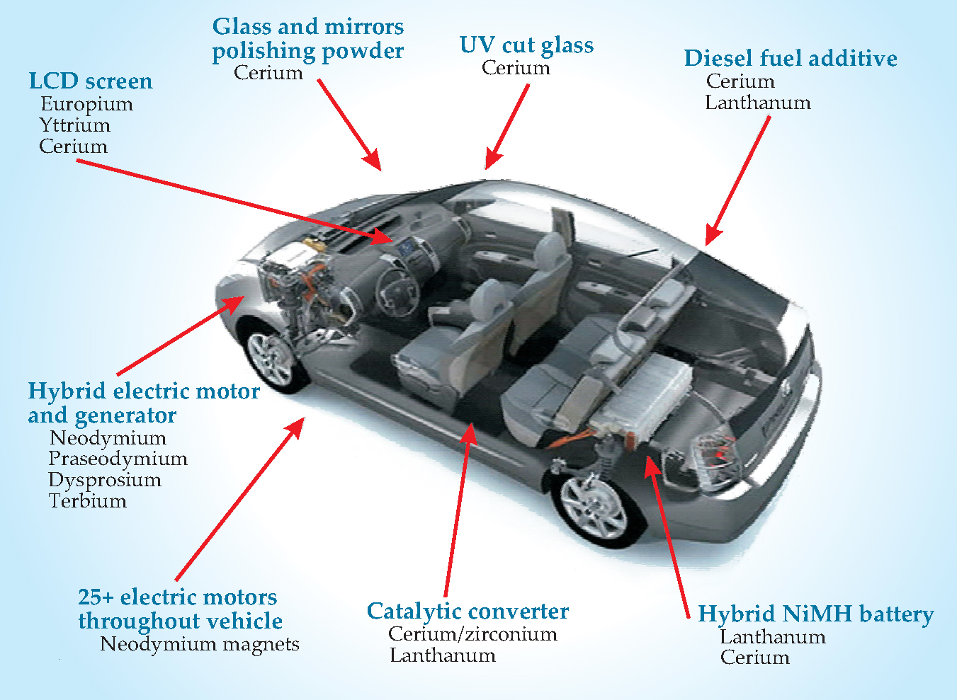 Although applications of rare earths are numerous and diverse, their largest single use is in permanent magnets, in which neodymium is combined with iron and boron to form the strongest magnets known. Compared with ferrite or alnico-alloy permanent magnets, Nd2Fe14B versions offer weight savings, smaller size, and better performance at elevated operating temperatures. Those features make rare-earth magnets the choice for the electric motor-generators that propel today’s hybrid-electric vehicles. A Prius motor-generator, for example, contains a kilogram of neodymium, plus smaller amounts of other rare earths: praseodymium, dysprosium, and terbium (see diagram). In addition, some 10 kg of the rare earth lanthanum is contained in the nickel-metal hydride battery of a typical hybrid.