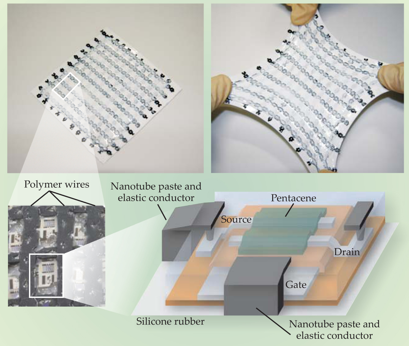 This electronic circuit (top panels) consists of a 10 × 10 array of organic transistors connected by a matrix of conducting polymer wires doped with single-wall carbon nanotubes. Coated in white silicone rubber, the matrix can be stretched up to 70% without affecting its electrical or mechanical properties. The rows and columns of black elastic wires, better visible in the enlargement (bottom left), attach to the gate and source contacts of each pentacene transistor through a conducting paste, also synthesized from nanotubes. The schematic illustrates the connections. Such a transistor array could drive pixels in a display.