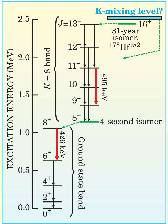 The Hf state is an example of a so-called K isomer. Not only is the spin of the excited nucleus very high (J = 16), but its projection on the nuclear symmetry axis, denoted by the quantum number K, is also 16. Selection rules for low-multipole electromagnetic decay severely inhibit transitions that change K. That’s why the isomer takes so long to venture the first decay step—down to a band of different J states with K = 8 (see figure 1). The bottom state of that band is another isomer, with a halflife of only 4 seconds, that briefly bars the way to the K = 0 ground-state band.
