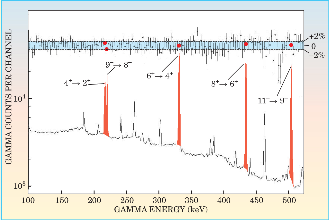 Figure 2. No acceleration of the decay of 178Hfm2 was found in an experiment at Argonne National Laboratory in which the hafnium isomer was subjected to intense pulses of broadband synchrotron radiation.6 Red peaks in the recorded gamma-ray spectrum, labeled by spins of the transition states, are those for which the Texas collaboration had previously reported enhancement by x-ray triggering. The blue band shows percent differences between gamma counts recorded in the first and second 11-second intervals after an x-ray pulse. If triggering had occurred at the reported level, the red data points (corresponding to the red peaks) should have been significantly higher than surrounding points.