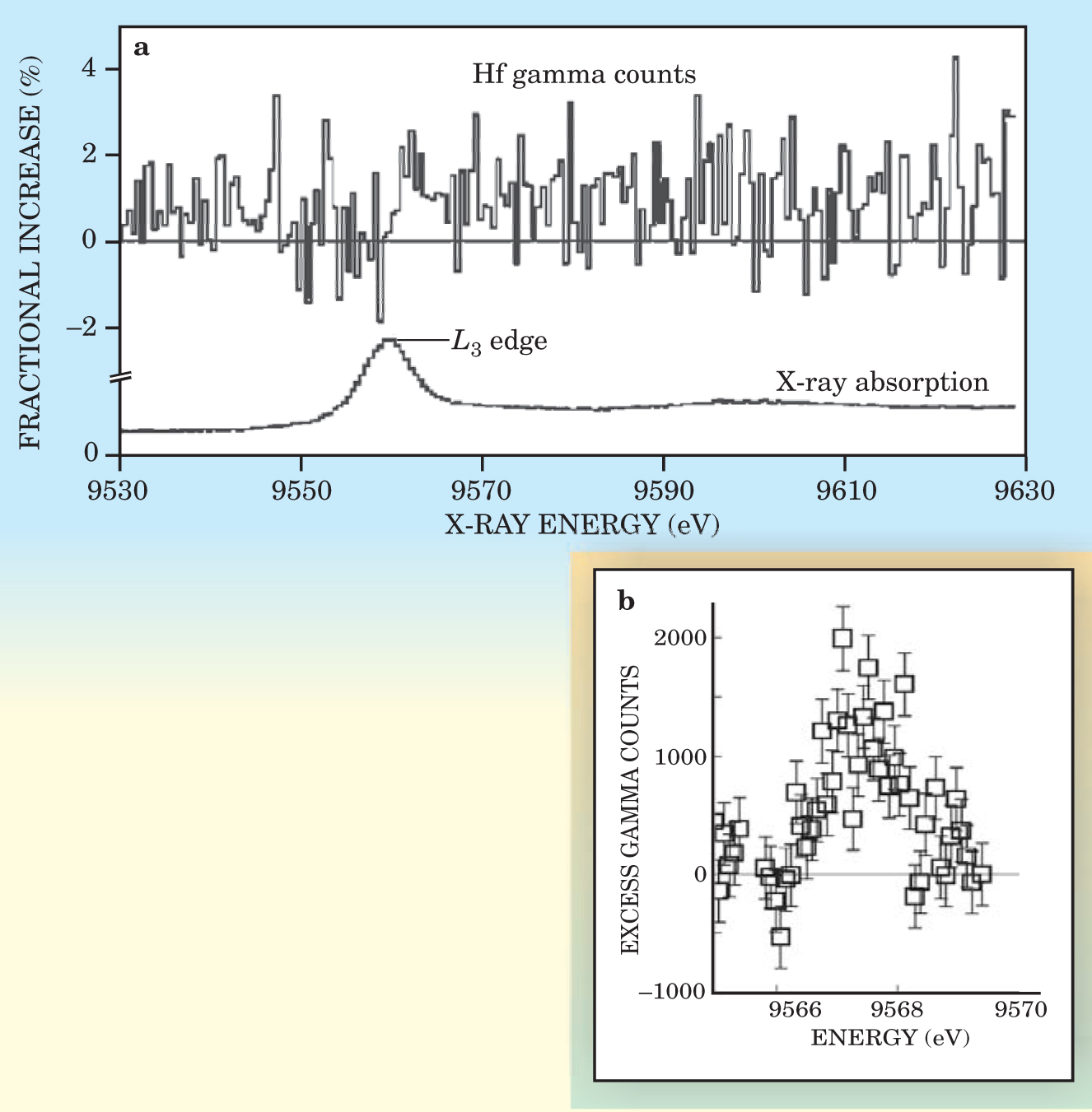 Meanwhile, Collins had moved his experimental effort from the modest x-ray unit at his Center for Quantum Electronics on the Dallas campus to the formidable SPring-8 synchrotron light facility near Osaka, Japan. Instead of the intense broadband x-ray beam favored by the APS group, Collins and company opted to use a monochromator and thus sacrifice intensity in favor of narrow-band tunability. Early in 2002, they reported a 4-standard-deviation enhancement of isomer-decay gammas just above the 9.56-keV threshold for x-ray ionization of electrons in atomic hafnium’s L shell (see figure 3(a)).