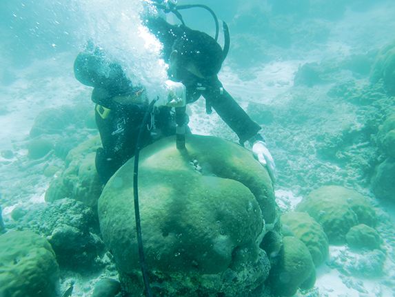 To ensure a sufficiently long record, Ren’s team collected 20 coral cores from colonies around the atoll. As coauthor Thomas DeCarlo explains, sampling is conducted with an eye toward the coral’s long-term health. “After removing a core, we plug the hole with cement and seal it with epoxy so the corals can grow back,” he says, “and we keep tabs on their recovery. We’ve never seen a colony die as a result of drilling.”