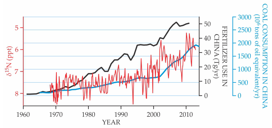Figure 2. As nitrogen emissions from China have increased, so has their influence on Dongsha Atoll. The coral-derived record of the relative 15N abundance δ15N (red), normalized to air exhibits a change in slope around the year 2000, as does the annual coal consumption (blue) but not the annual fertilizer use (black). (Adapted from ref.