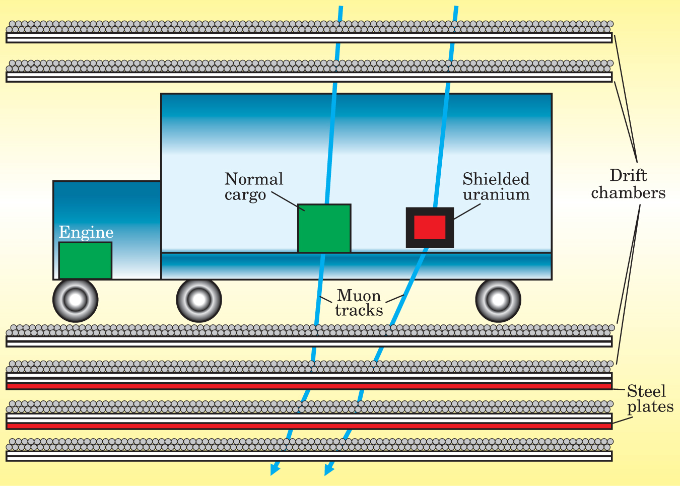 they reported experimental and computer simulations that suggest the feasibility of locating small quantities of fissile material concealed in ordinary cargoes at US border crossings and seaports. With relatively inexpensive and well-tried particle-physics tracking chambers installed in drive-through facilities at border checkpoints, they argue, one could spot a 10-cm cube of a high-Z material like uranium or its lead shielding, hidden in a truckload of sheep, or even steel, in just one minute of observation.