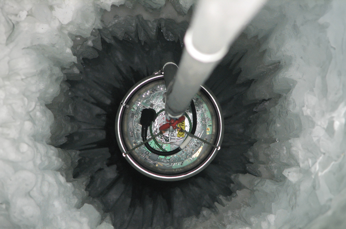 Light sensors for the IceCube Neutrino Observatory are lowered into the Antarctic ice. (Image by Mark Krasberg, IceCube/NSF.)