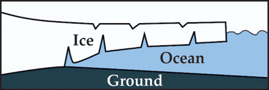 Crevasses may make ice shelves more stable. In Antarctica and elsewhere, ice sheets and glaciers flow down toward the coastlines and continue out into the ocean, where they form thick, floating ice shelves like the one sketched here. Such shelves eventually break, through calving or large-scale collapse. Crevasses on ice shelves are thought to contribute to those processes, but studies of their contributions have mostly focused on the stresses and dynamics near a single crevasse. New theoretical work by Wendy Zhang, Douglas MacAyeal, and colleagues at the University of Chicago considers multiple crevasses and shows that collectively they can add mechanical resilience to ice shelves. In a crevasse-free ice shelf, disturbances from ocean waves, tides, and storms will spread through, and flex, the entire shelf. But as the researchers demonstrate, a periodic arrangement of crevasses forms a bandgap. Like bandgaps in numerous other systems—including photonic crystals, semiconductors, and even underwater sandbars—the crevasse-induced bandgap blocks excitations in a certain range of frequencies from propagating through the ice shelf; instead, the flexing is confined to a small region near the shelf edge. The team finds that the bandgap persists in the presence of some disorder, such as in the crevasse arrangement or the shelf thickness. The ice-shelf responses within and outside the bandgap, suggest the researchers, may play a role in the differing regimes of ice-shelf evolution. (J. Freed-Brown et al., Ann. Glaciol., in press.)