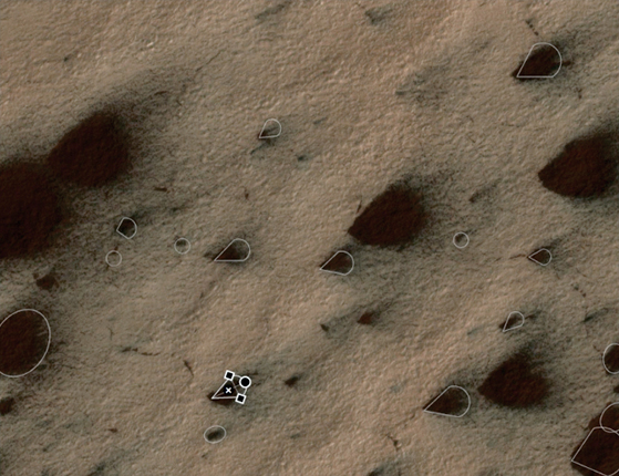 In Planet Four, volunteers help study Martian climate and wind patterns by mapping dark seasonal fans near Mars’s south pole in images from NASA’s High Resolution Imaging Science Experiment (HiRISE) camera. Fan-shaped regions show up in spring and summer and are believed to be from dirt-carrying carbon dioxide geysers that rise a meter or so above the ice cap and fan out due to winds.
