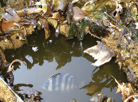 On 11 March 2011, a magnitude 9 earthquake off the east coast of Japan rocked the country’s Tohoku region and generated tsunami waves with heights reaching 40 meters. In the ensuing days, buoys, fishing vessels, four large fisheries docks, and more were launched into the Pacific Ocean. The provenance of that detritus can be determined from explicit markings and other, more subtle forensic clues. And now a team led by James Carlton of Williams College has documented that the debris has carried at least 289 living species—including mollusks, crustaceans, and fish—from Japan to the Hawaiian Islands and the Pacific coast of North America; the photo shows one arrival, a barred knifejaw fish stowed in the stern well of a fishing vessel from the Iwate prefecture. Indeed, new species have continued to arrive at least up until February of this year, the most recent date considered by Carlton and company.