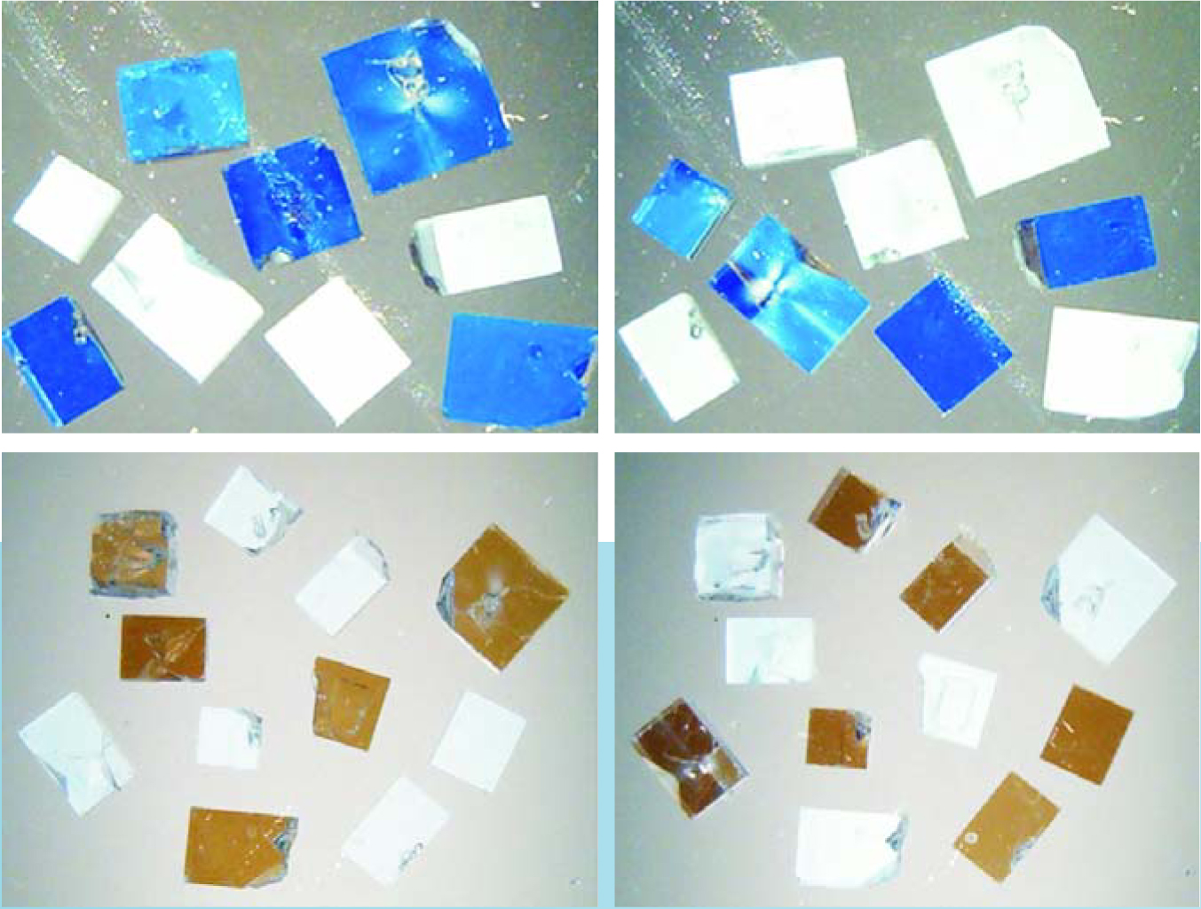 Figure 1. To determine chirality, sodium chlorate crystals are placed on top of a linear polarizer and viewed through a second, initially crossed polarizer. When the crossed polarizer is rotated clockwise, right-handed crystals appear blue. When the polarizer is rotated counterclockwise, left-handed crystals appear red.