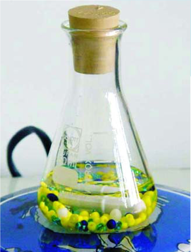 Figure 2. A metal bar, controlled electromagnetically, forces crystals between glass beads and breaks them up. At the same time, new crystals form. Eventually chiral purity results.