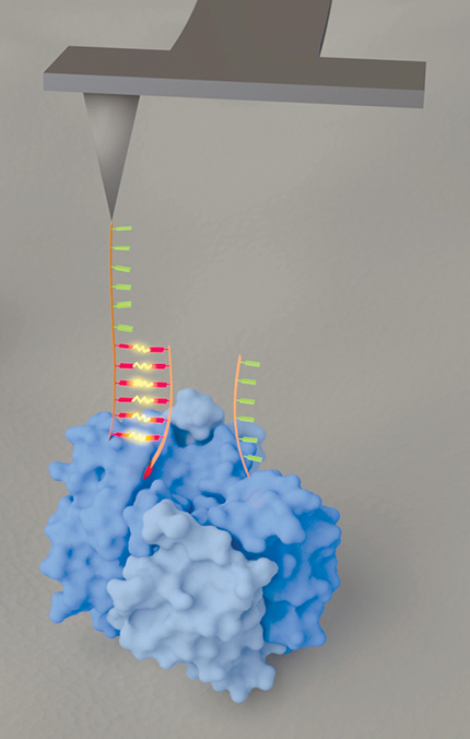 Figure 1. An atomic force microscope outfitted with two DNA hexamers, shown in red and green, one dangling from the end of the other. The complementary strands, shown in like colors, are attached to chemical groups of interest in a protein (blue). When one of the hexamers at the end of the tip locates its complement (and thus the associated chemical group), the two strands briefly bind, and the T-shaped cantilever is seen to twist. (Courtesy of Ozgur Sahin.)