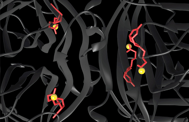 Figure 2. The crystal structure of the streptavidin–biotin complex, with the streptavidin protein structure shown in dark gray and the biotin molecules shown in red. The yellow spheres represent the AFM-derived positions of the ends of the biotin molecules—in agreement with their crystal-structure positions to within 0.2 nm. (Adapted from ref.