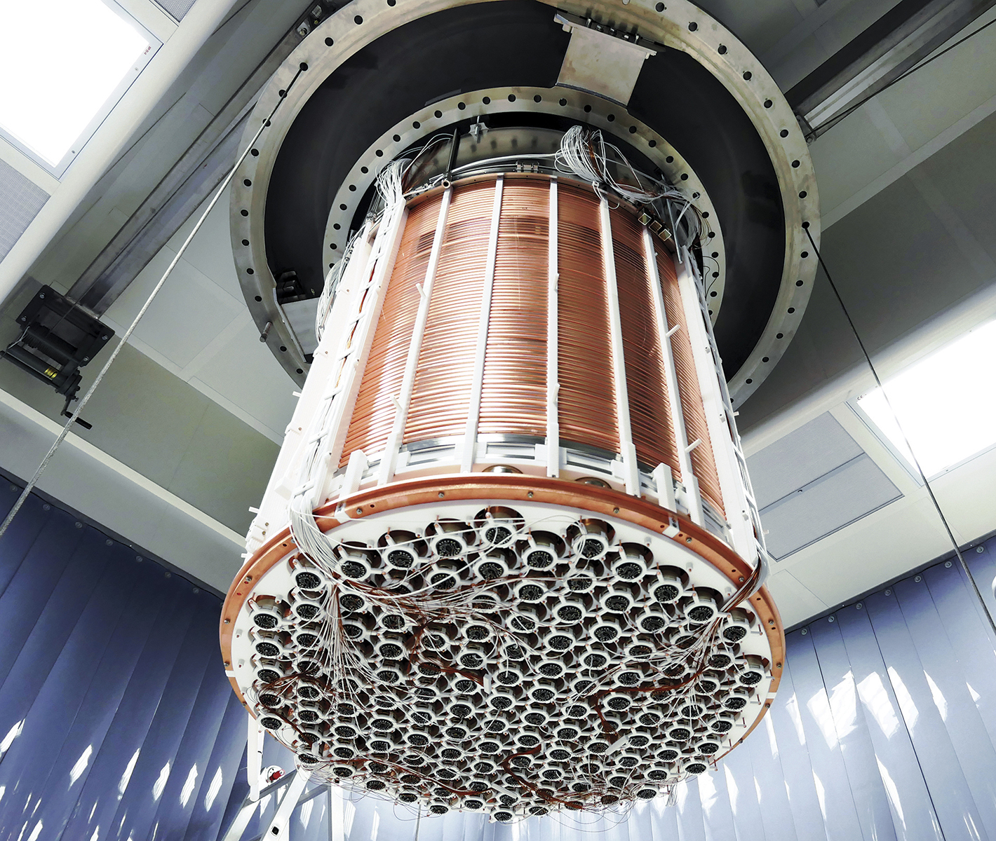 The XENON1T detector before it was installed in 2016. The cylindrical vessel, roughly 1 m across and 1 m high, contained 3.2 tons of mostly liquid xenon at an operating temperature of −96 °C. The top and bottom faces were lined with photomultiplier tubes to detect and measure the energies of scattering events and radioactive decays. (Courtesy of the XENON collaboration.)