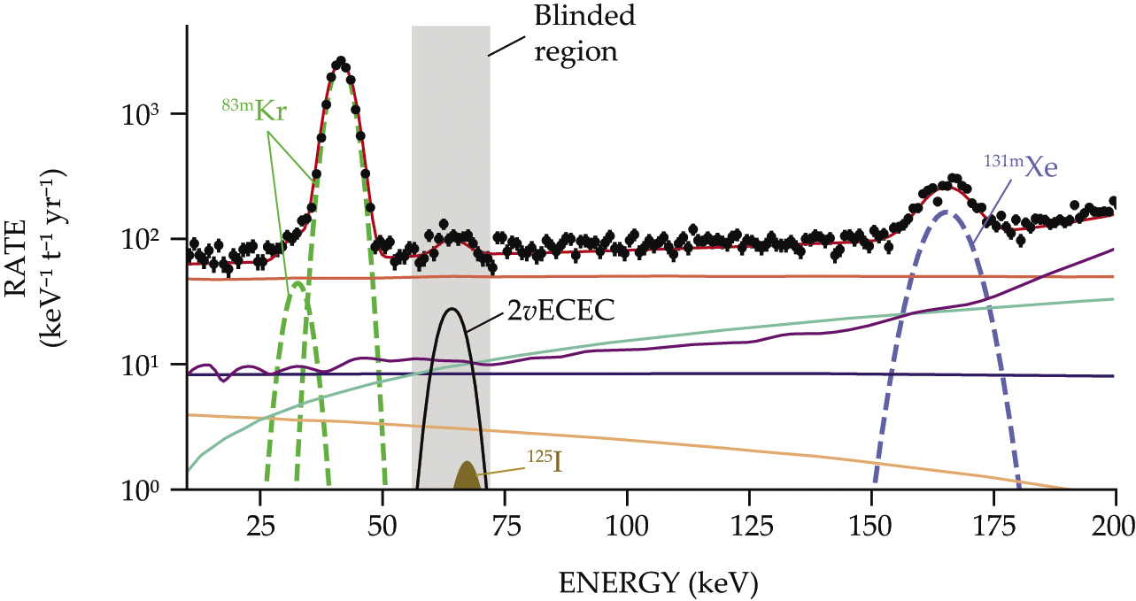 From the start, the XENON researchers were prepared to look for 2νECEC. So they wouldn’t be biased by their perception of the results, they kept the data between 56 keV and 72 keV hidden, or blinded, until the data taking and background characterization were complete. And they took measures to combat an especially pesky source of background: When 124Xe captures a neutron, it transforms into 125Xe, then iodine-125, then an excited state of 125Te, which emits a signal at 67 keV that’s easily mistaken for the 2νECEC signal at 64 keV. They can’t prevent that sequence of reactions, but they can stop it in its tracks: The half-life of 125I is 59 days, and they can purify their detector of all iodine much faster than that.