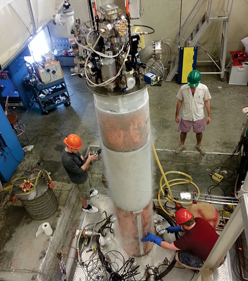 A roughly $1 million dilution refrigeration system will cool ADMX-Gen2 to a few hundred millikelvin, which will reduce thermal noise and thereby increase the sensitivity of the University of Washington–based hunt for axions. The experiment, shown in the photo, involves tuning a radio receiver to detect axions in a magnetic field as they convert to microwave photons.