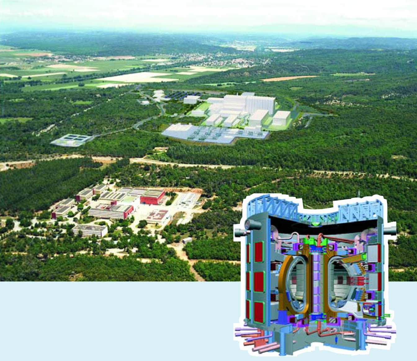 Cadarache, home to the French atomic energy center, will host ITER. The fusion facility’s tokamak (inset) will be housed in the largest building.