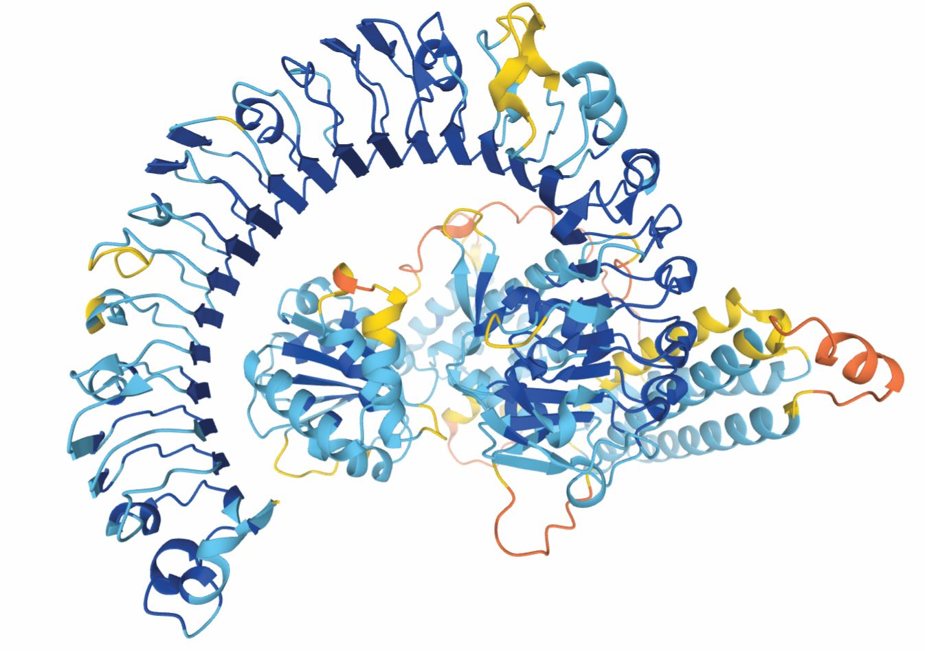 From AlphaFold’s vast collection of protein structure predictions comes this protein, which may promote disease resistance in the Eurasian wildflower Arabidopsis thaliana. The colors represent regions of the protein predicted with high (blue) through low (yellow and orange) confidence. The structure has yet to be observed experimentally. (Courtesy of the AlphaFold Protein Structure Database, CC BY 4.0.)