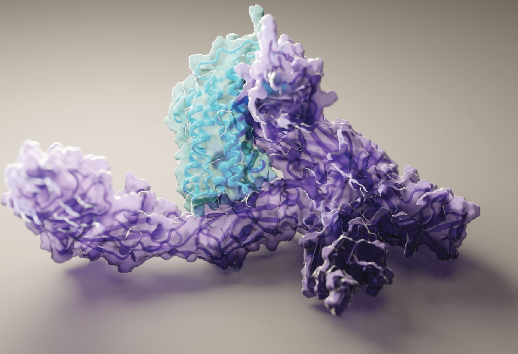RoseTTAFold generated this structure of the human signaling protein interleukin-12 (purple) bound to its receptor (blue). Although the structures of molecular complexes are tougher to predict than those of single proteins, the structure here agrees well with one found experimentally through cryoelectron microscopy. (Courtesy of Ian Haydon, Institute for Protein Design, University of Washington.)