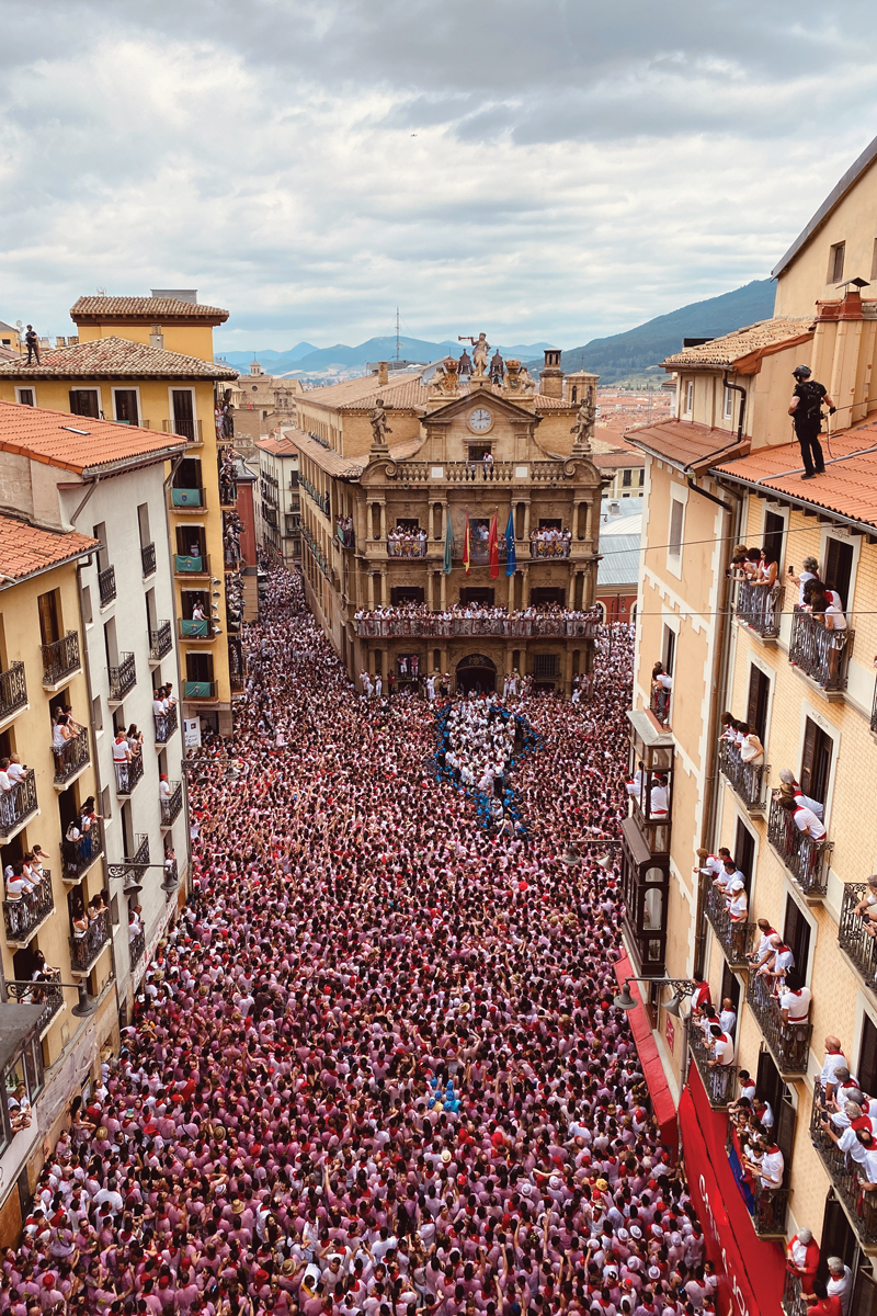 The San Fermín festival in Pamplona, Spain, is perhaps best known for the running of the bulls through the streets each 7–14 July. The festivities kick off on 6 July with the opening ceremony, which attracts thousands of revelers to the plaza in front of the Pamplona city hall. Shown here is the beginning of the ceremony, in which security personnel (dressed in blue) and musicians (wearing white) emerge from the city hall and move through the crowd of revelers (whose white clothes by this point are stained pink with sangria). In the hour leading up to the ceremony, the crowd gradually assembles, grows denser, and displays collective dynamics. (Photo courtesy of the Bartolo Lab, ENS de Lyon.)