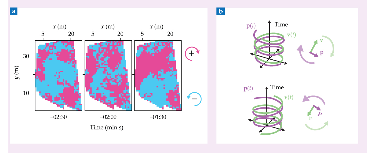 Mirror symmetry is locally broken by the eddy-like undulations in a dense crowd. (a) The crowd as a whole, however, has no collective preference for clockwise or counterclockwise oscillations, as seen in these three plots of the handedness of the 2023 San Fermín crowd in the minutes before the opening ceremony. (b) An active-matter model shows how the symmetry can be broken spontaneously by initial conditions. In the model, the state of the crowd at time t is characterized by the velocity field v and the propulsive force field p. The two vectors rotate in tandem, with the direction of the rotation determined by their initial relative orientations. (Images adapted from ref. 2.)