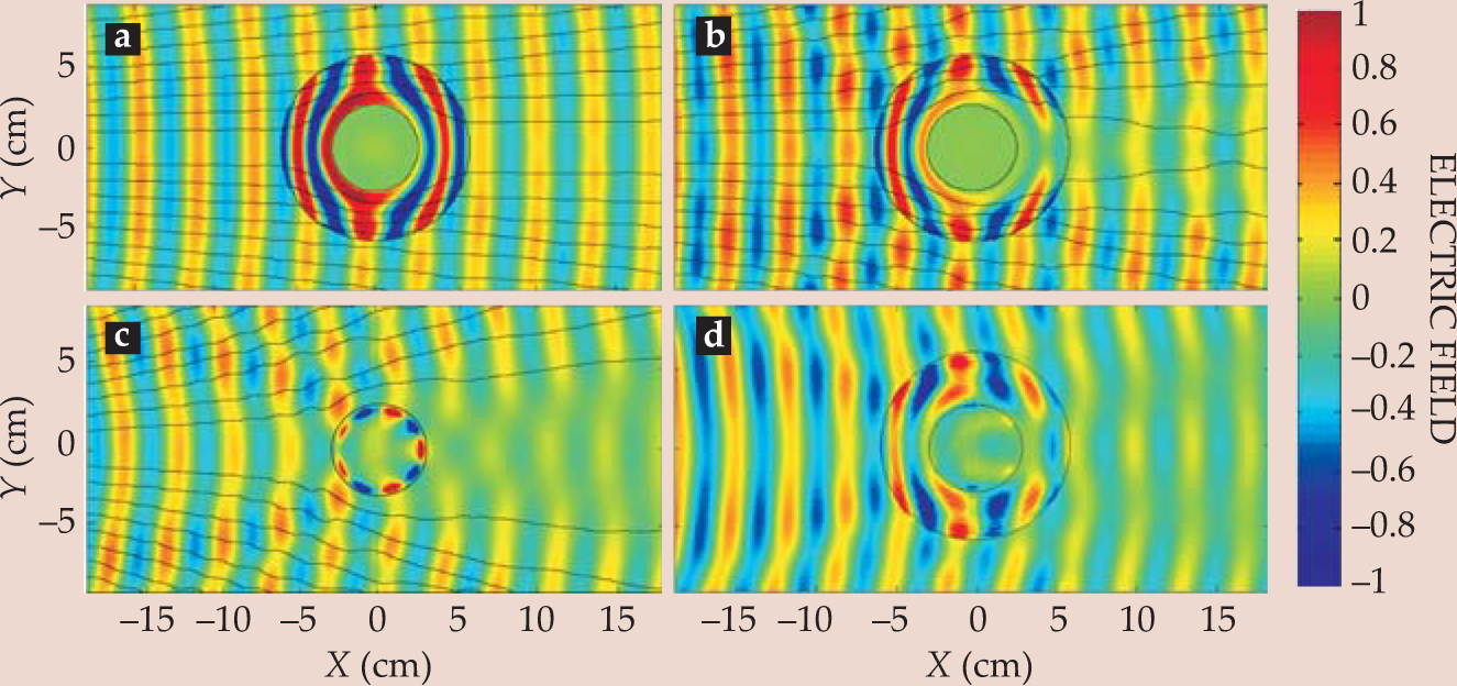 Figure 2. Snapshots of the electric-field patterns and direction of power flow (black lines) reveal the effect of perfect and imperfect cloaking as polarized microwaves approach from the left. The cloak lies in the annular region between black circles and surrounds a copper cylinder. (a) Simulation of waves dispersing within an ideal cloak whose material properties ε and μ correspond to an exact coordinate transformation. (b) Simulation of a cloak whose simplified values of ε and μ are those of the actual device. (c) Experimental measurement of a bare copper cylinder, uncloaked. (d) Experimental measurement of field patterns in the actual cloak. In each case the electric field is measured or simulated at various points along a Cartesian grid.