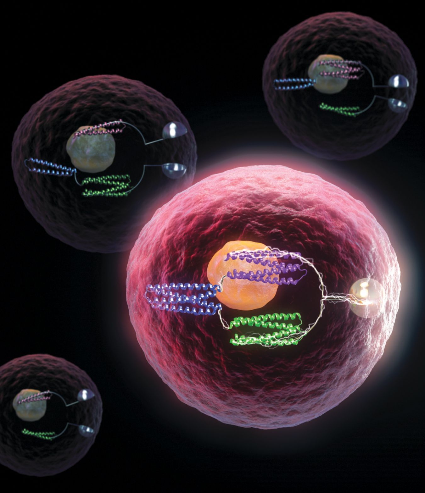 Protein logic gates inside a living cell turn bioluminescence on and off. (Conceptual illustration courtesy of MolGraphics.)