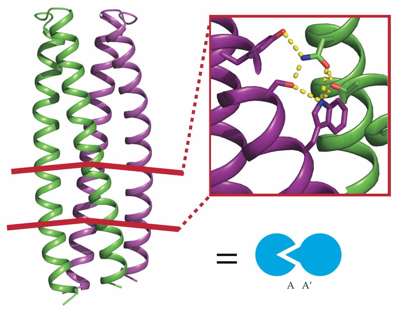 Two designer protein monomers A and A′ (green and purple coils) form a dimer through a network of complementary hydrogen bonds, as shown in the inset. The heterodimer they form, A:A′, is represented by the interlocked symbols shown in blue. (Adapted from ref.
