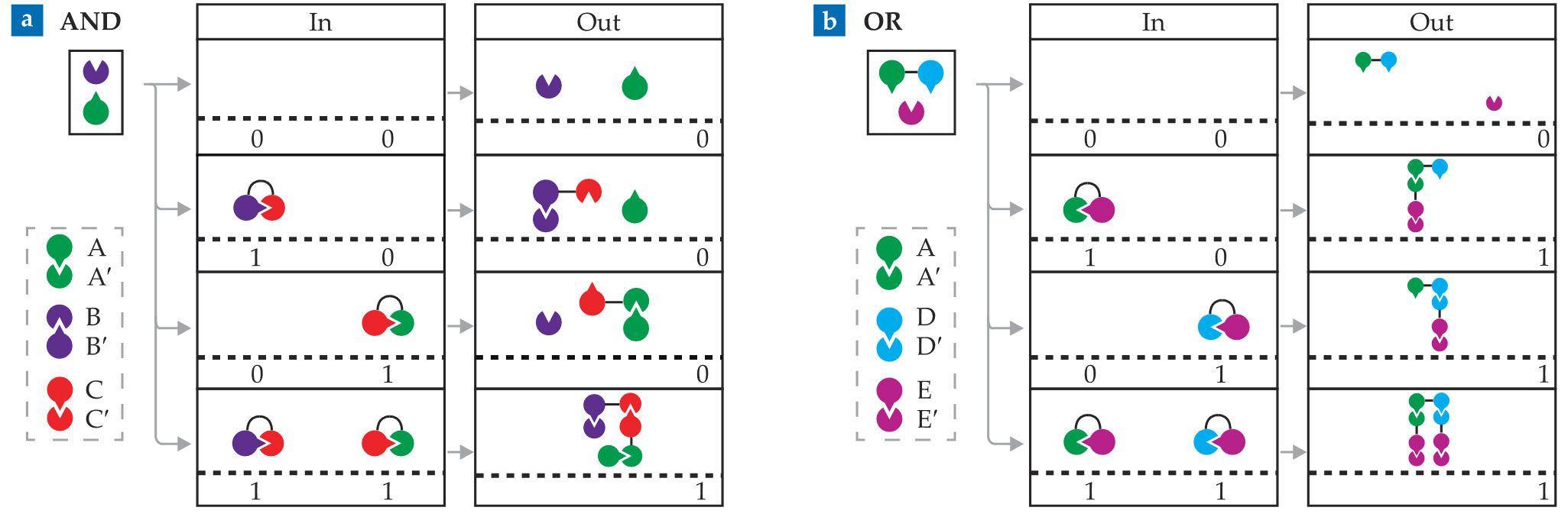 AND and OR gates can be constructed from combinations of isolated and linked protein monomers. (a) An AND gate can be made from three pairs of complementary monomers—A:A′, B:B′, and C:C′. In the presence of A and B monomers, complexes of A′ and C monomers (A′–C) and C′ and B′ monomers (C′–B′) serve as inputs. A and B are joined, an output signal of 1, only if all monomers form a single complex, as in the bottom row. (b) Surrounded by E′ monomers and A–D complexes, the inputs A′–E and D′–E produce a single output complex —a signal of 1—when at least one input is present, as in an OR gate. (Adapted from ref.