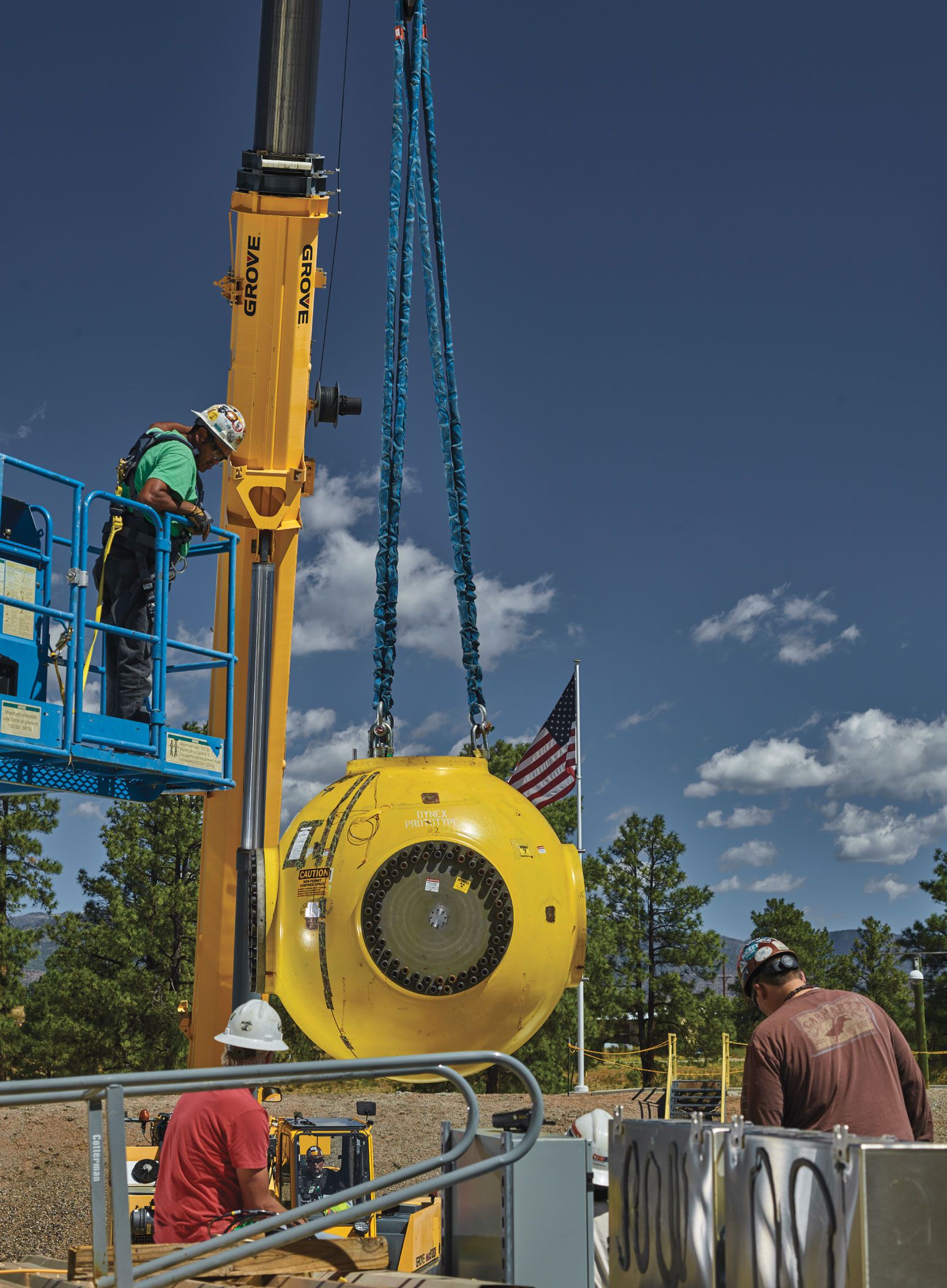A blast containment chamber is lowered into place at the Dual-Axis Radiographic Hydrodynamic Test facility at Los Alamos National Laboratory. Explosive tests on mock pits made from surrogate metals are used to help determine how plutonium will compress as the pit of a nuclear weapon implodes.