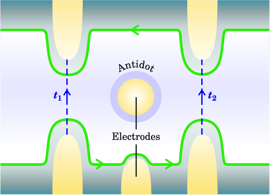 Figure 2. A quantum Hall interferometer could establish an essential requirement of topological quantum computing: that quasiparticles be nonabelian. Two pairs of point contacts make it possible for quasiparticles flowing in edge currents (green) to tunnel across the Hall bar. Because the tunneling is coherent, the two currents t1 and t2 interfere with each other. Biasing the lower central electrode or the electrode above the antidot changes the period of the interference pattern if the quasiparticles are nonabelian, but doesn’t if they’re not.