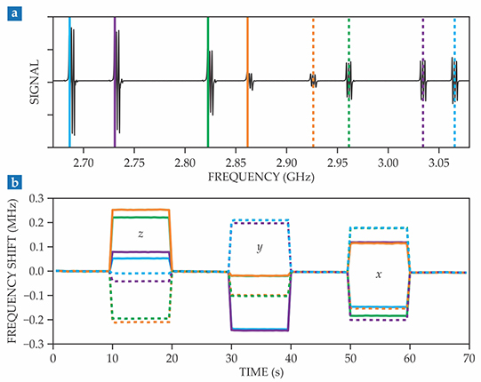 The microwave-resonance spectrum (a) of an ensemble of nitrogen–vacancy centers. A bias field of 7 mT separates the resonances so they can be spectrally distinguished; solid and dotted lines of the same color represent the two resonances of each spatial orientation. (b) Additional fields of 10 µT applied in the z, y, and x directions produce measurable frequency shifts from which the field vector can be reconstructed. (Adapted from ref. 2.)