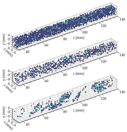 Figure 2. The positions and sizes of liquid water droplets reconstructed from three holograms taken during flight through a cloud. Droplet sizes are indicated by color, with dark blue for droplets less than 10 μm and light blue for droplets between 10 μm and 12 μm. The top panel is an unmixed cloud volume. The middle panel is a volume after dry and moist air have fully mixed and droplet distribution has become uniform in space, albeit more sparse than the undiluted volume. The bottom panel is a volume in which turbulent mixing has produced a highly inhomogeneous distribution of droplet number density. (Adapted from ref.