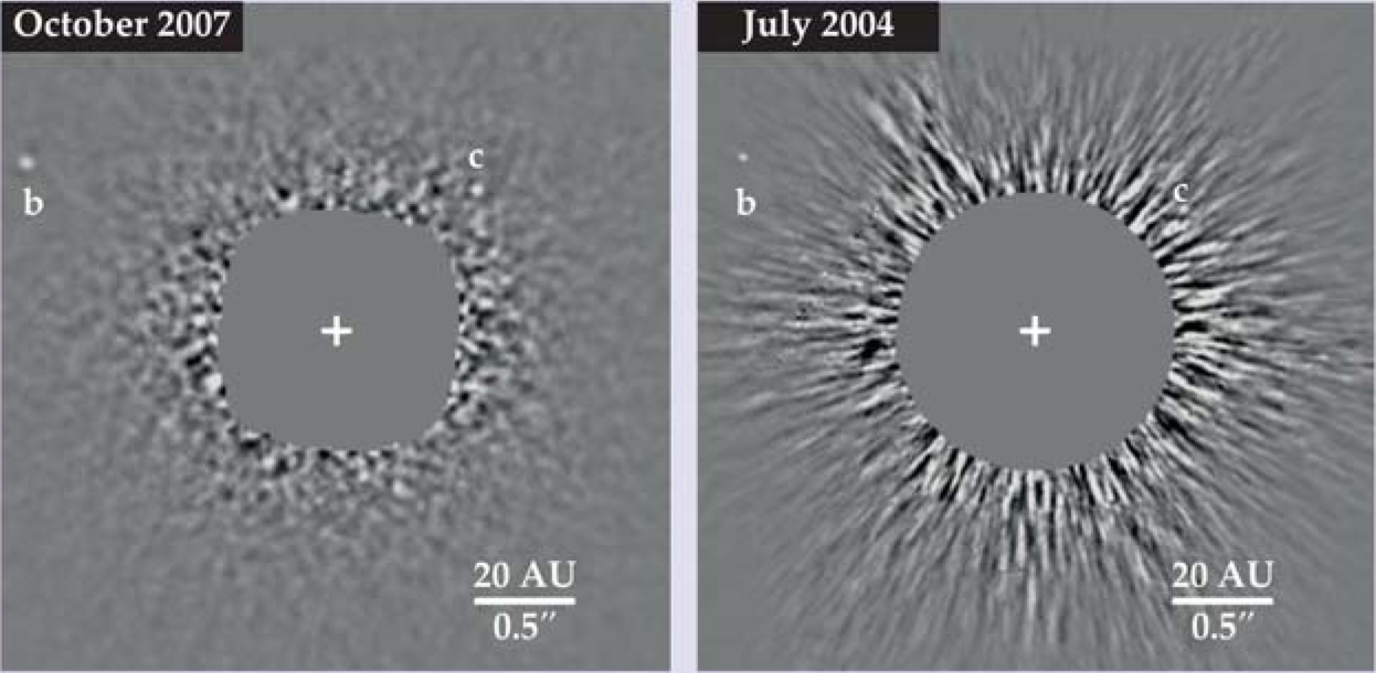 Figure 1. The two outermost planets (labeled b and c) of the three found orbiting the young star HR 8799 at distances from 24 to 68 astronomical units (AU) were discovered in adaptive-optics IR images taken with the 8-m Gemini telescope in October 2007. (1 AU is the mean distance between Earth and Sun.) The obscuring glare of the star, whose position is marked by the cross, was suppressed by a technique called angular differential imaging (ADI); here the residual glare has been entirely erased from the central region. After the discovery, the two planets were found again, at slightly rotated positions, in a reanalysis of near-IR images that had been taken, without benefit of ADI, at the 10-m Keck II telescope in July 2004.